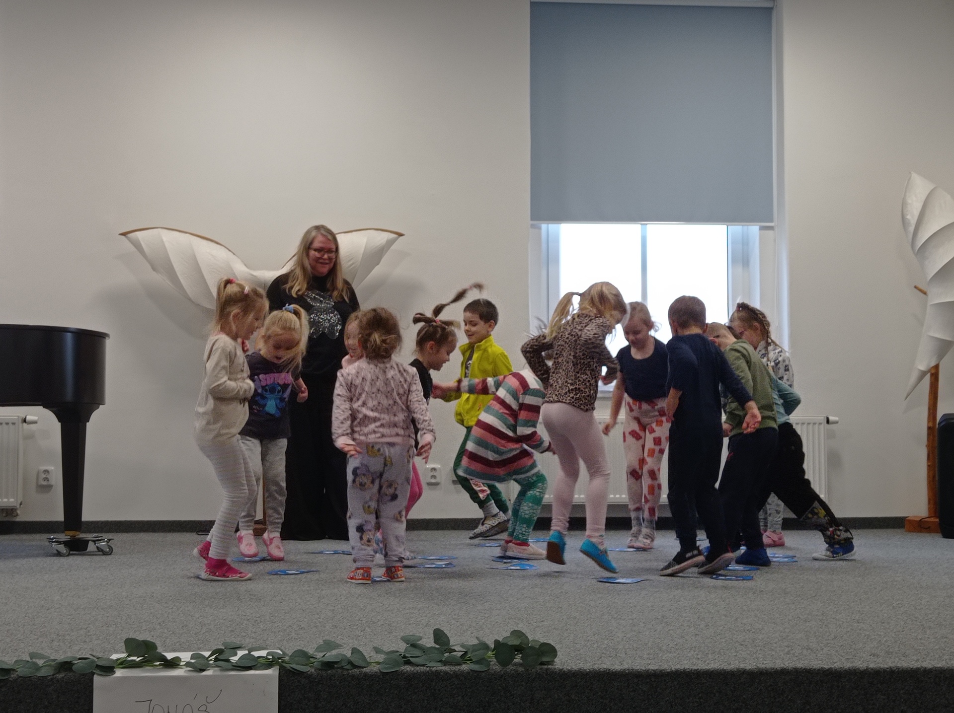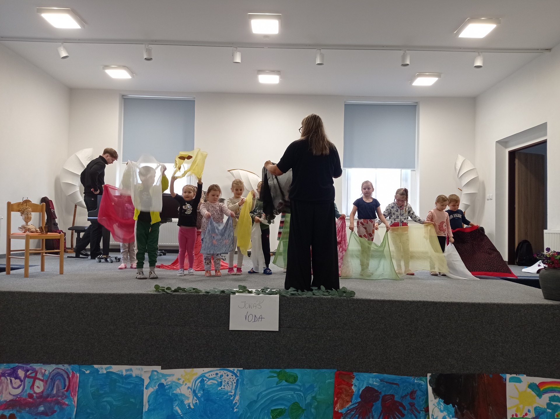 Zazpívali jsme si úvodní písničku s Jonášem a pak si chvíli povídali o tom, jaké zvuky může voda vydávat. Jemné kapičky jsme předváděli jemným poklepáváním prstíků na dlaň, při velké bouřce jsme dupali. Paní učitelka měla různé hudební nástroje a opravdu některé zněly jako bouřka, mořské vlny, potůček....společně jsme si na ně zahráli při zpěvu písně Prší, prší. Abychom nezpívali jen známé písně, naučili jsme se novou písničku. Zatančili si se šátky, se kterými jsme předváděli jemné vlnky měnící se v rozbouřené moře.