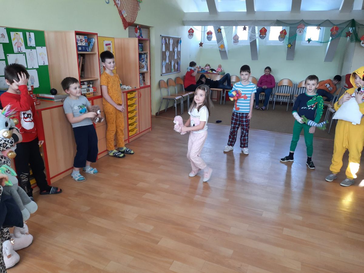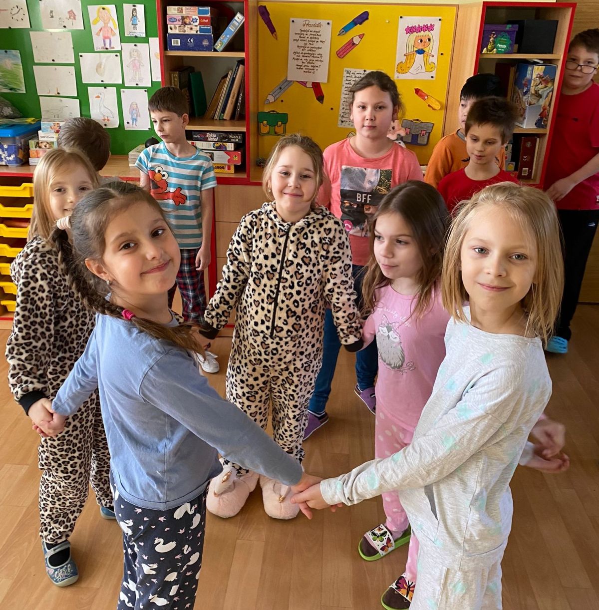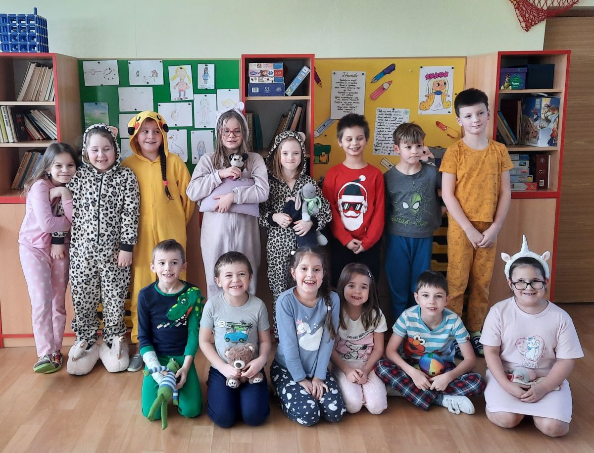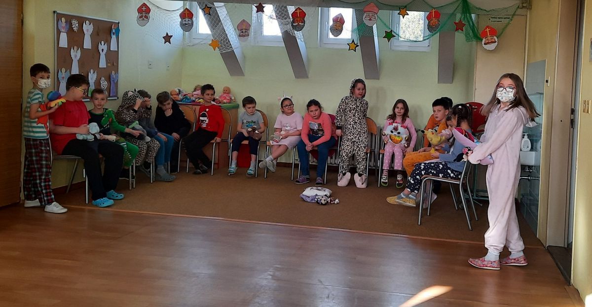 28.ledna jsme si v družině uspořádali párty. Nebyla však obyčejná, ale pyžamová. Všichni jsme si přinesli pyžama, oblíbený polštářek, plyšáčka a zábava mohla začít. Odpoledne jsme začali ukolébavkou. Každý si našel na koberci místečko a chvilku relaxoval. Poté jsme pokračovali módní přehlídkou pyžámek, následovala oblíbená hra židličkovaná. Také nám "projela" v družině mašinka a nechyběla ani diskotéka, kde všichni tancovali a zpívali a to vše na známé dětské písničky. Pyžamovou párty jsme ukončili tak, jak jsme jí zahájili a to ukolébavkou, kde si každý lehl na svůj polštářek, zavřel oči a vzpomínal na krásně strávené odpoledne.