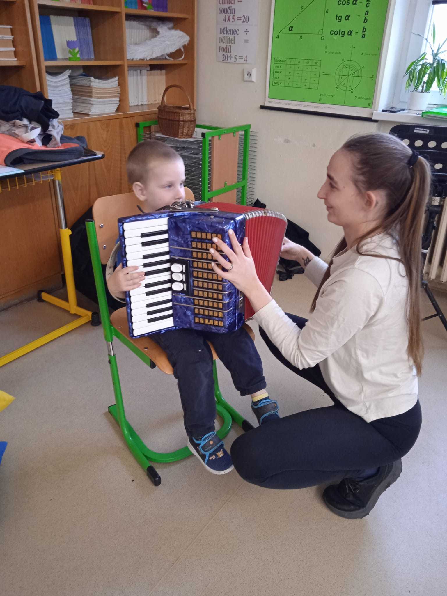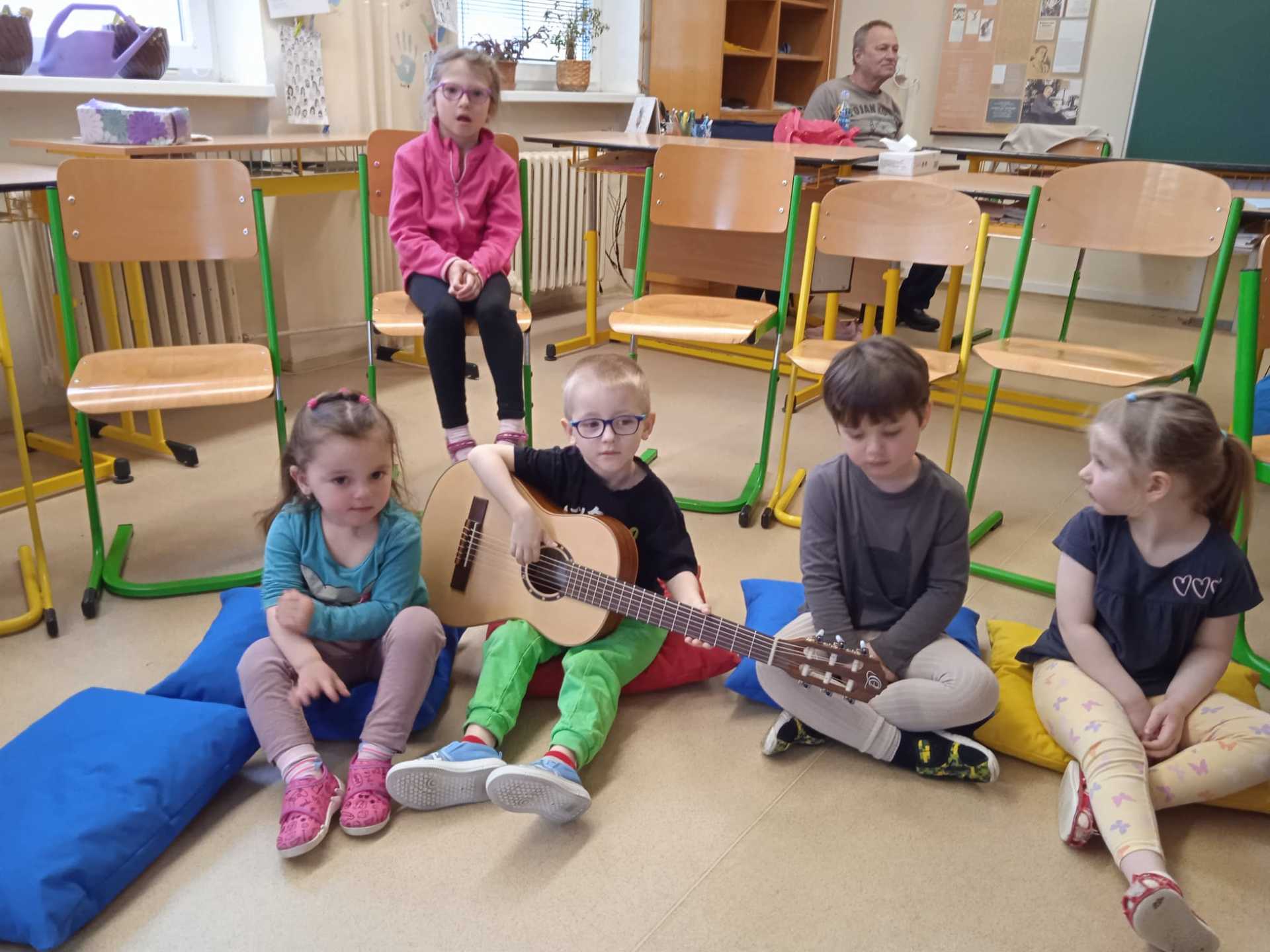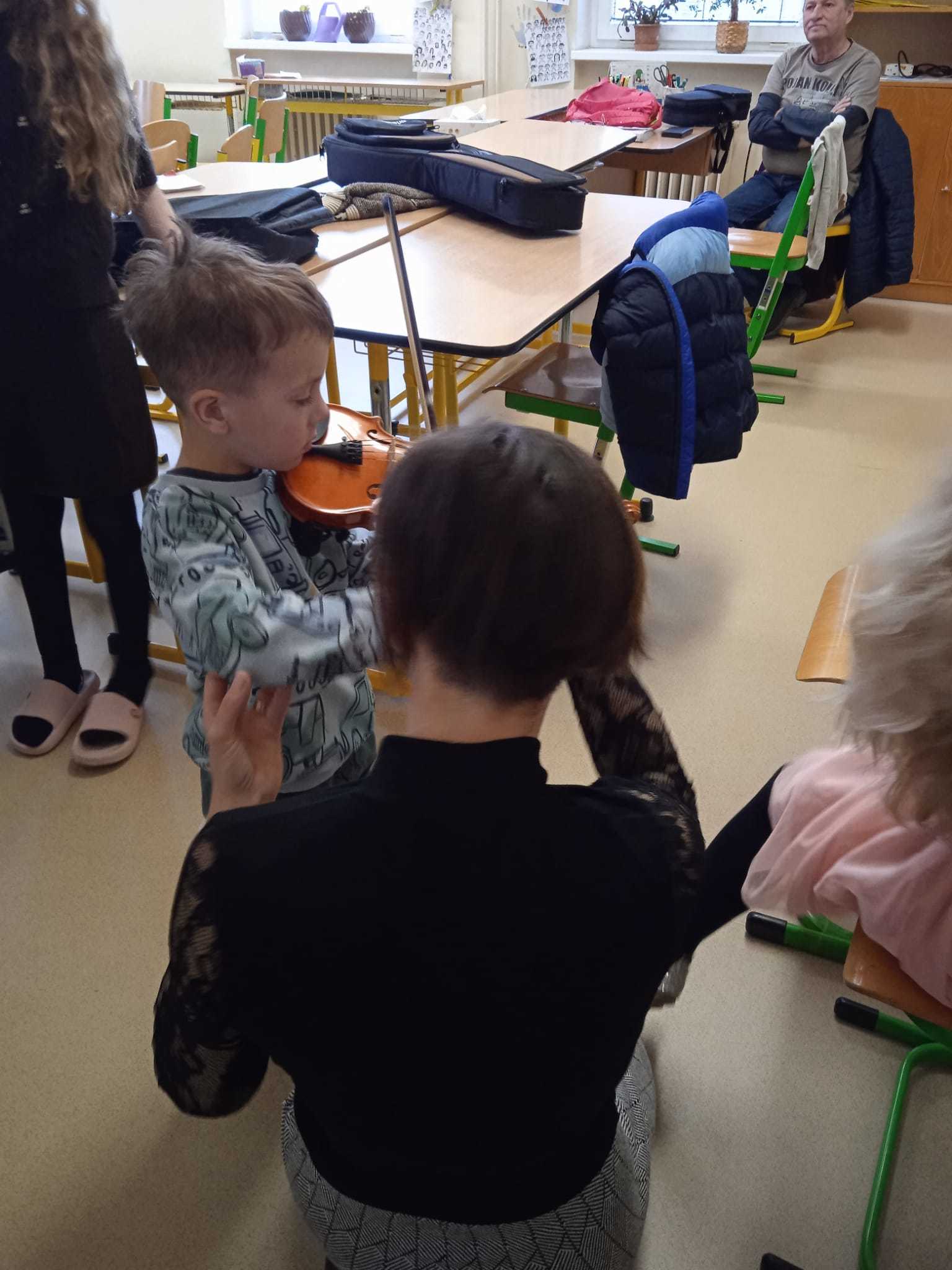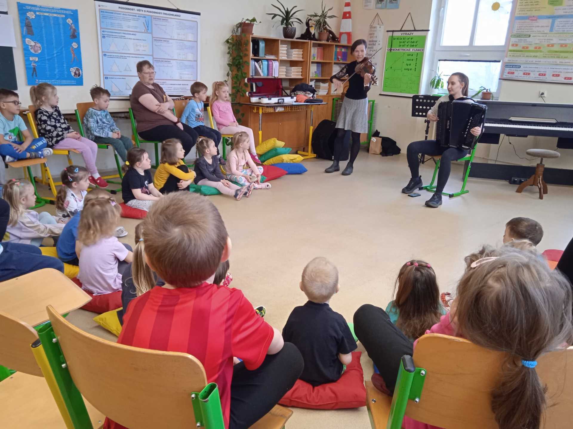 V pátek 10.4.2026 k nám přijely paní učitelky ze ZUŠ z Habartova. Přivezly si s sebou svoje žáky s různými hudebními nástroji. Seznámili jsme se s houslemi, kytarou, flétnou, klavírem a s akordeonem.