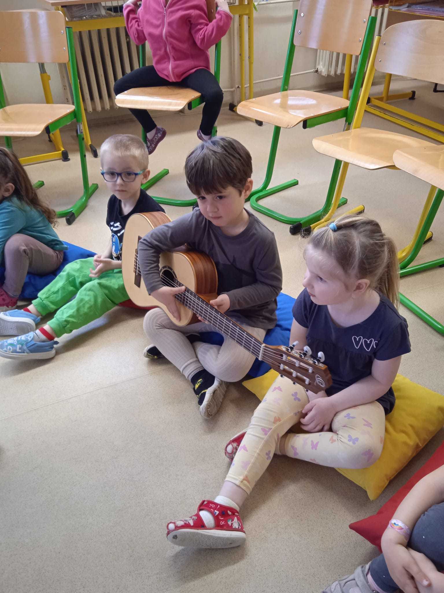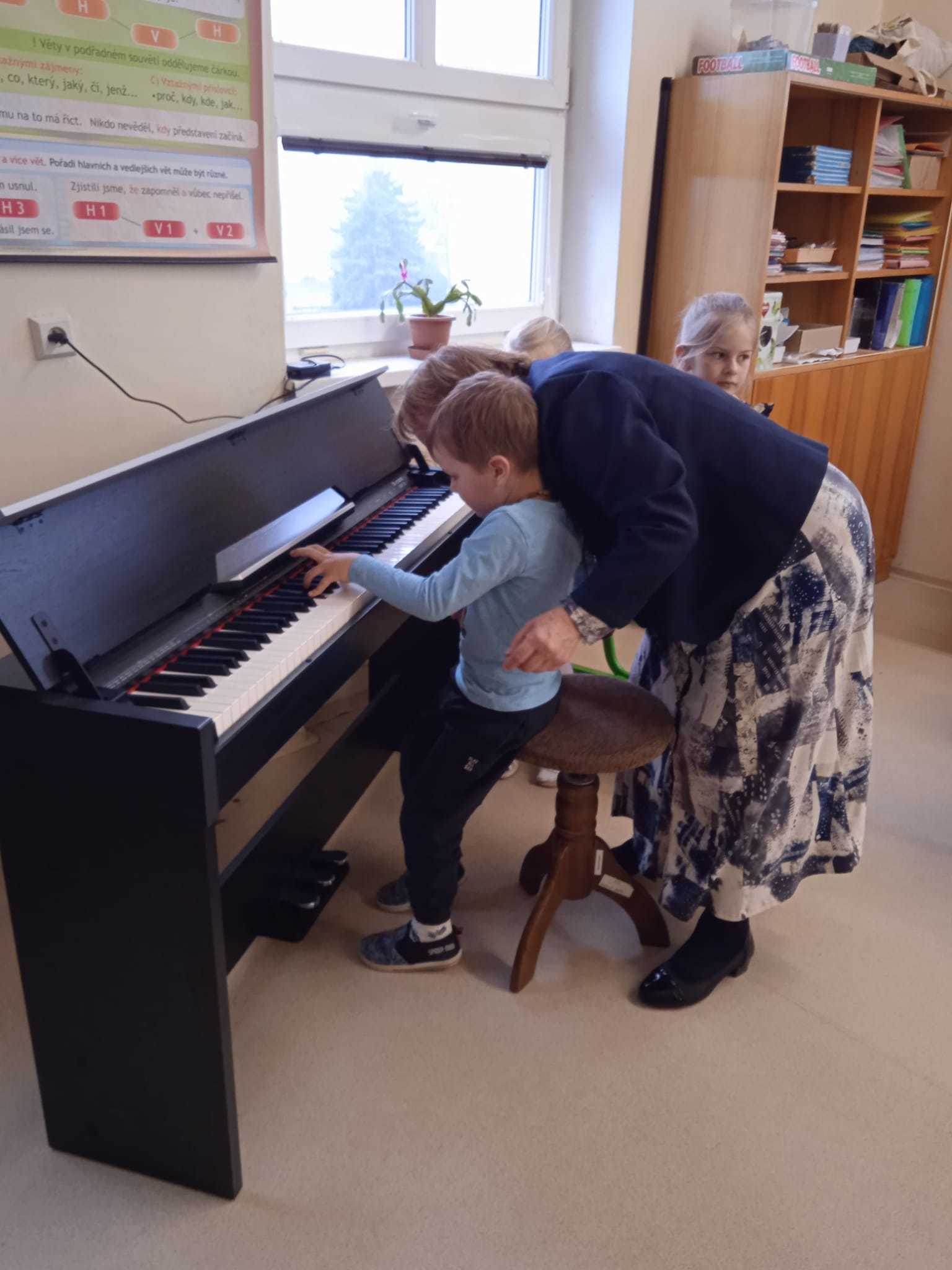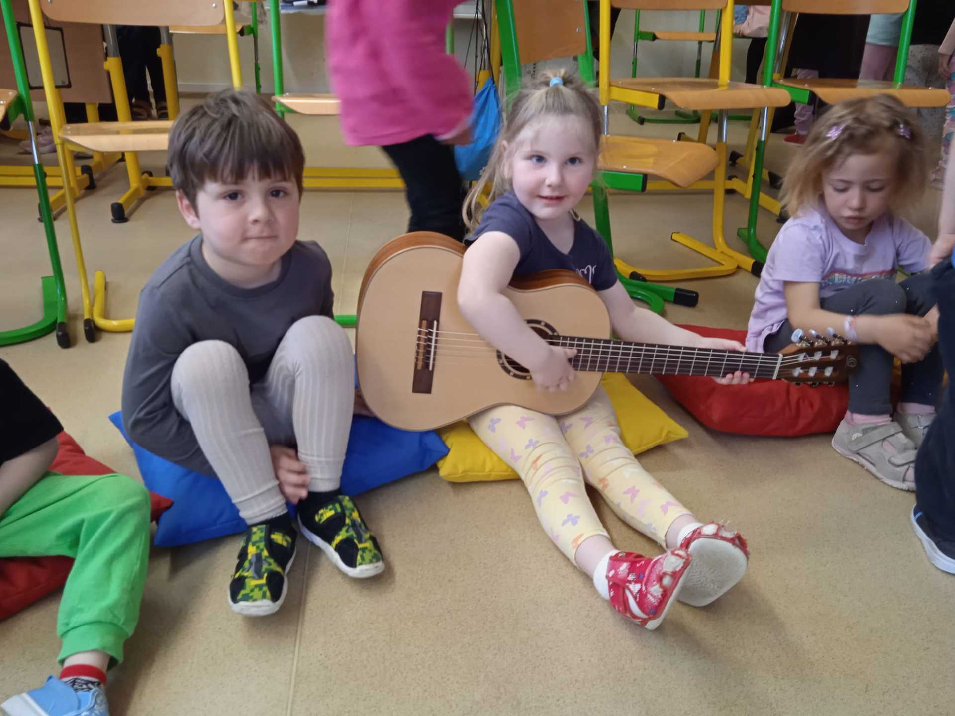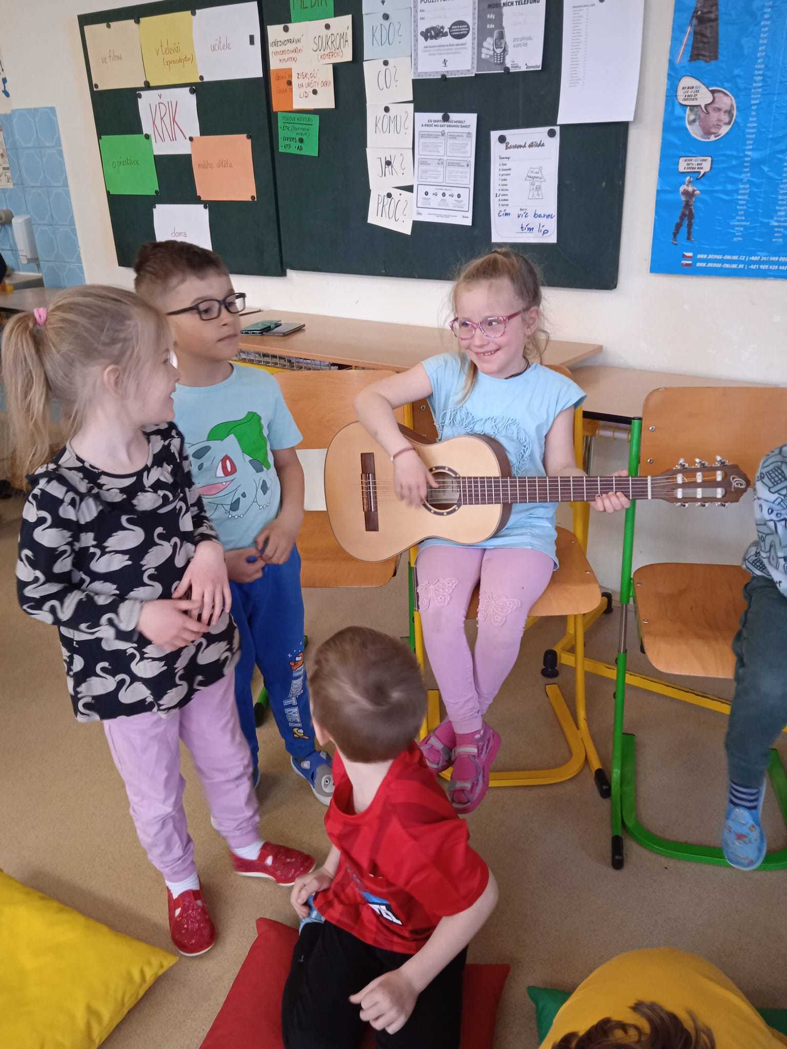 V pátek 10.4.2026 k nám přijely paní učitelky ze ZUŠ z Habartova. Přivezly si s sebou svoje žáky s různými hudebními nástroji. Seznámili jsme se s houslemi, kytarou, flétnou, klavírem a s akordeonem.