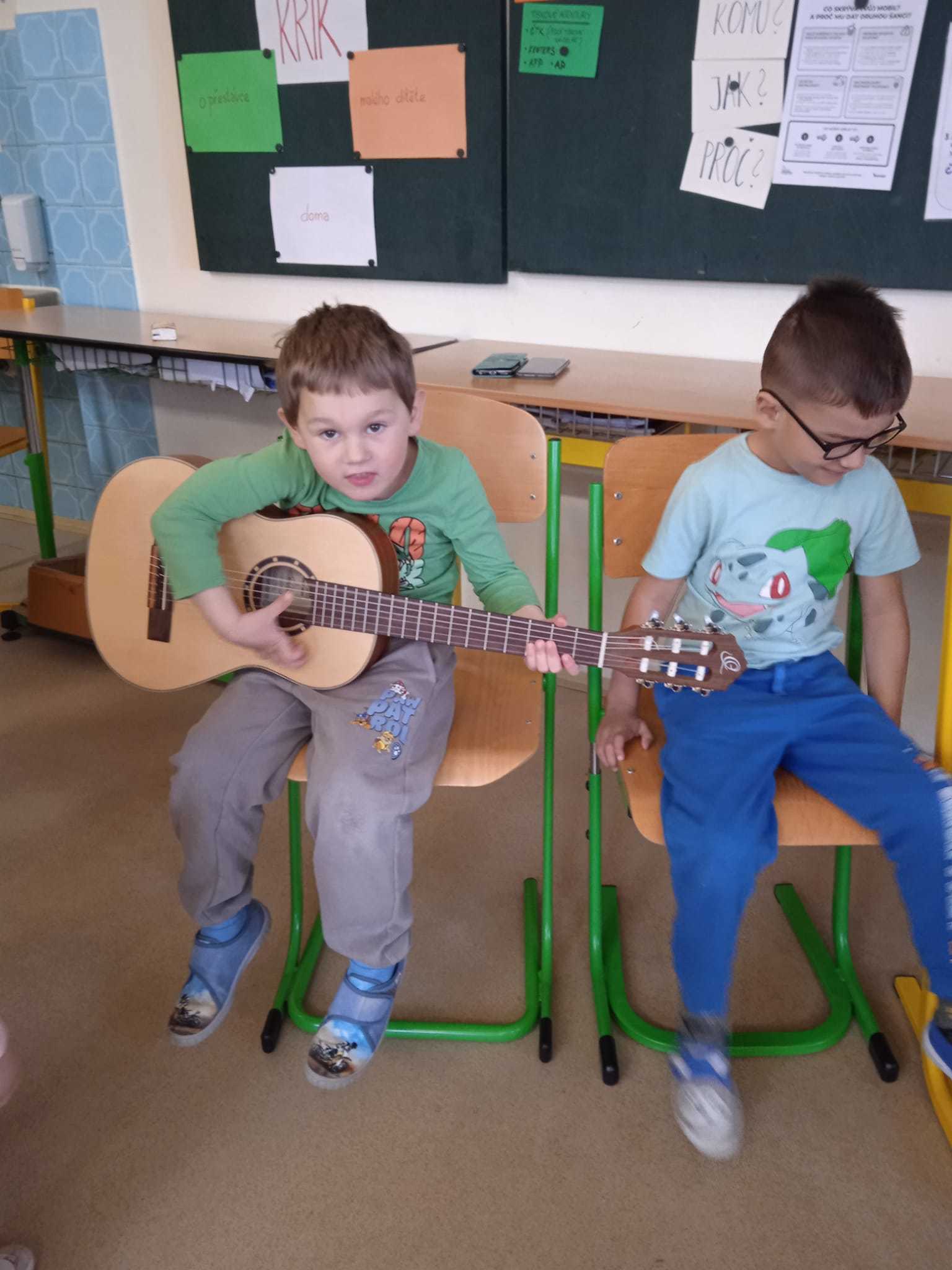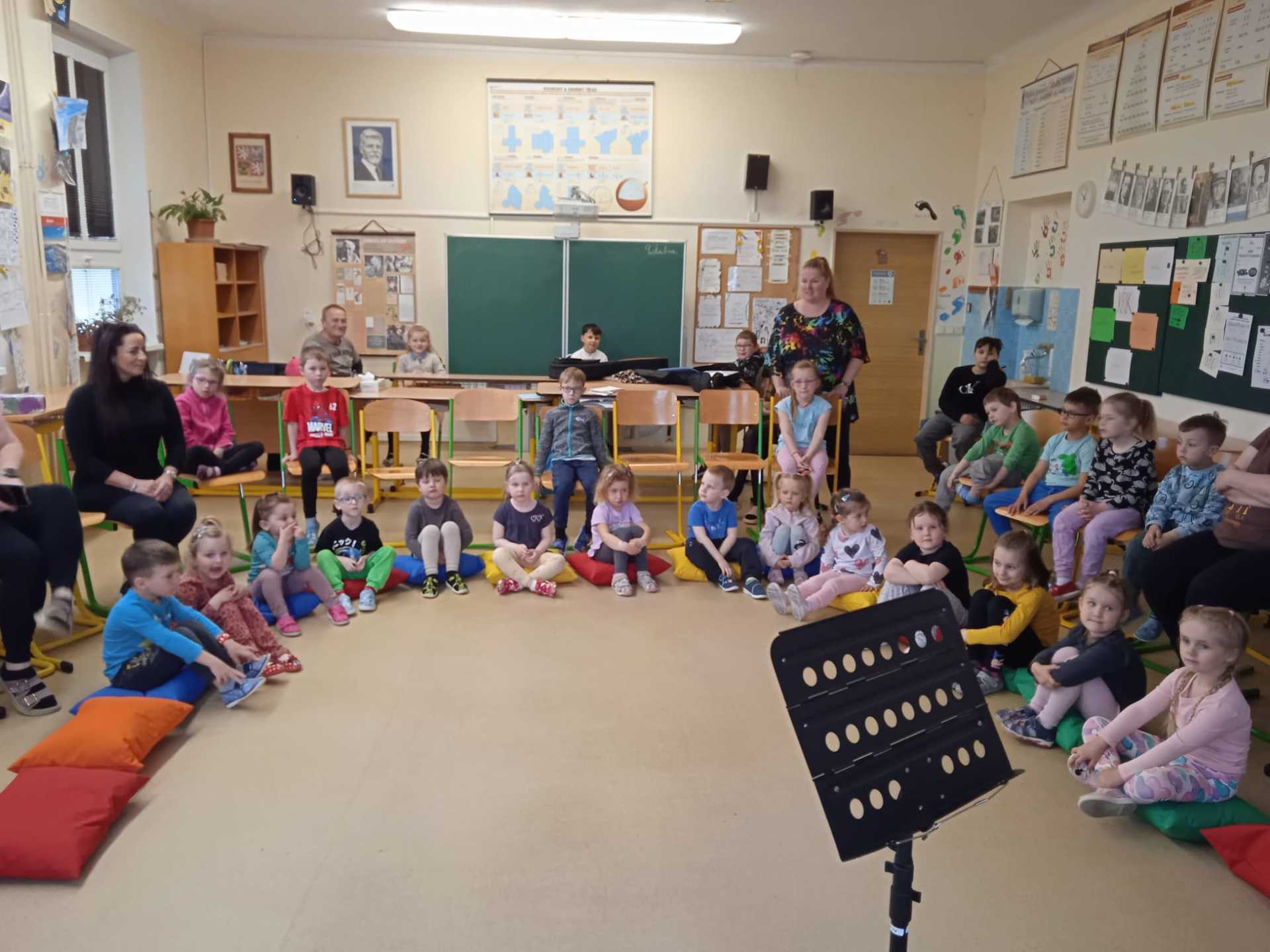 Na úvod jsme si poslechli příběh o Toníkovi, který hledal hudbu. Nejprve ji našel u vody, pak v lese, dokonce i v pekle ji slyšel. Po návratu hledal na louce a nakonec i na lodi. Zjistili jsme, že krásný hudební nástroj je i náš hlas. Společně jsme si zazpívali tři písničky.